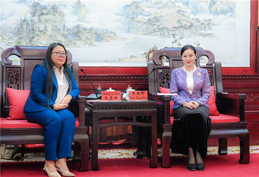 韋朝暉對凱素林一行的到來表示歡迎。她說,懷化是一個福氣滿滿的福地城市、充滿驚喜的寶藏城市、充滿活力的潛力城市。近年來,在湖南省委、省政府的堅強領(lǐng)導下,懷化加快建設(shè)國際陸港,打造對接RCEP的戰(zhàn)略平臺,不斷加深與RCEP成員國交流合作,已開通中老、中越、中緬等7條國際物流大通道,懷化國際陸港公海聯(lián)運跨境卡車班列可達緬甸清水河口岸,2024年懷化赴緬甸合作開展了雜交水稻育種項目,雙方合作空間廣闊、潛力巨大。希望緬甸駐南寧總領(lǐng)事館介紹更多緬甸企業(yè)、商協(xié)會來懷開展經(jīng)貿(mào)交流合作,實現(xiàn)互惠共贏。