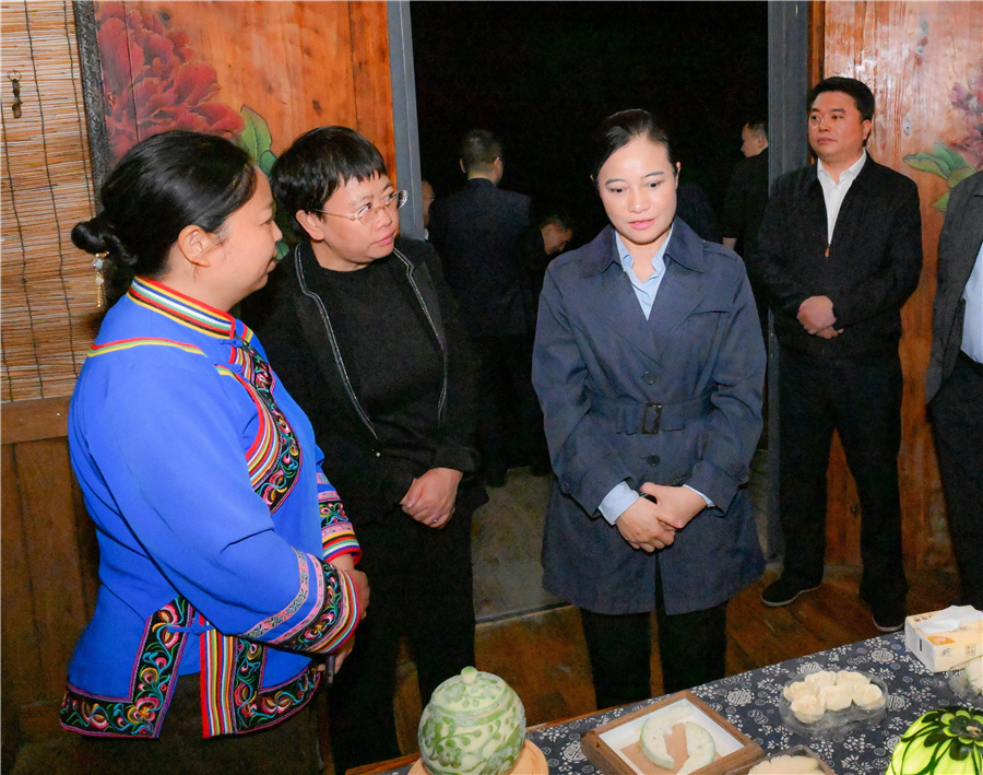 (10月19日,市委副書記、市政府黨組書記韋朝暉到靖州調(diào)研。圖為韋朝暉在靖州知青園調(diào)研雕花蜜餞非遺項目。懷化日報全媒體記者 潘雨 攝)