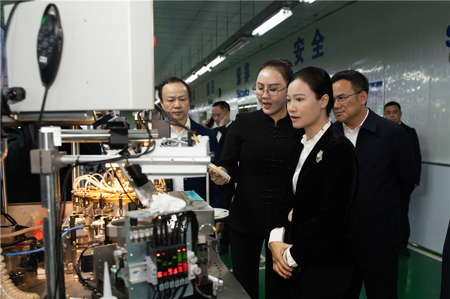 (10月26日,市委副書記、代市長韋朝暉在芷江調(diào)研。圖為韋朝暉在湖南華晟電通科技有限公司仔細(xì)了解全縣電子元器件產(chǎn)業(yè)鏈建設(shè)和企業(yè)生產(chǎn)經(jīng)營情況。懷化日報社全媒體記者 吳濤 攝)