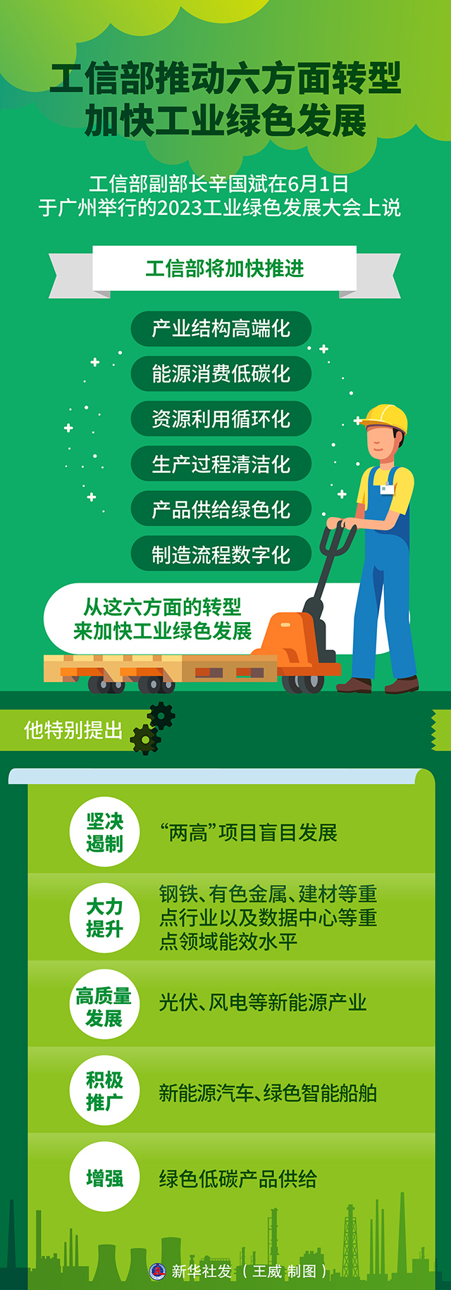 工信部副部長辛國斌在6月1日于廣州舉行的2023工業(yè)綠色發(fā)展大會上說,要通過加快推進產(chǎn)業(yè)結(jié)構(gòu)高端化、能源消費低碳化、資源利用循環(huán)化、生產(chǎn)過程清潔化等六方面轉(zhuǎn)型,全面推進工業(yè)綠色發(fā)展,將工業(yè)綠色發(fā)展作為新型工業(yè)化的重點,打造綠色新動能。
