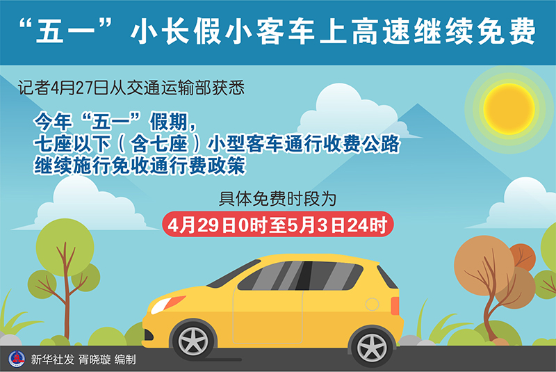 “五一”假期臨近。記者4月27日從交通運輸部獲悉,2023年“五一”假期,七座以下(含七座)小型客車通行收費公路繼續(xù)施行免收通行費政策,具體免費時段為4月29日0時至5月3日24時。