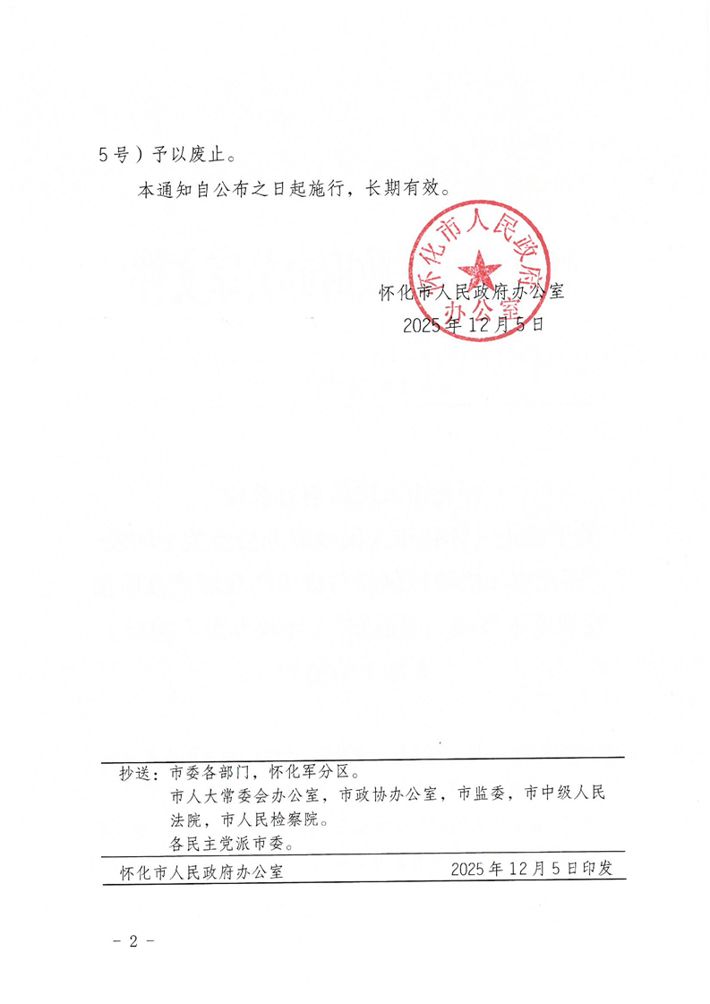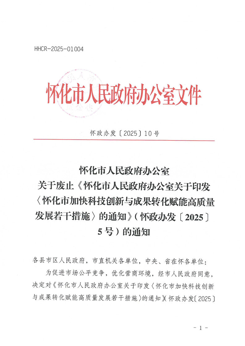 懷化市人民政府辦公室關于廢止《懷化市人民政府辦公室關于印發(fā)〈懷化市加快科技創(chuàng)新與成果轉化賦能高質量發(fā)展若干措施〉的通知》(懷政辦發(fā)〔2025〕5號)的通知