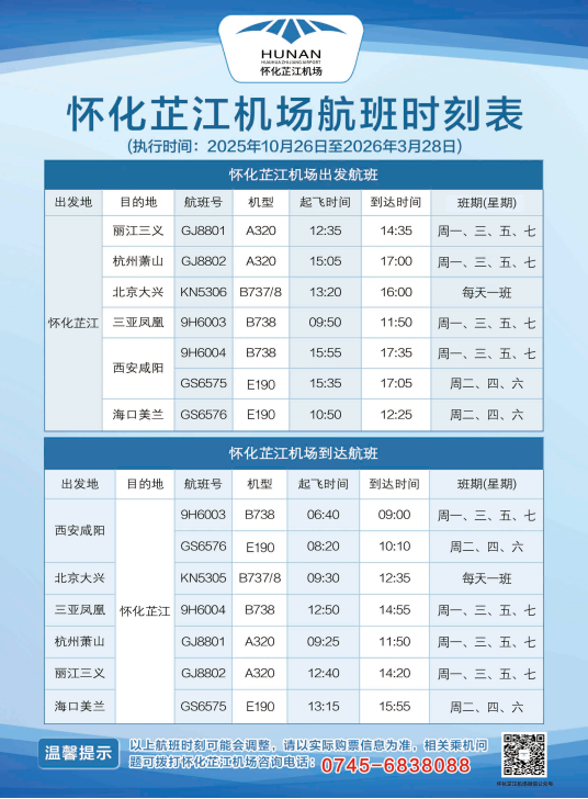 此外,提醒各位旅客,航班信息可能會(huì)變化,請以實(shí)際購票信息為準(zhǔn),如遇到相關(guān)乘機(jī)問題,歡迎撥打懷化芷江機(jī)場咨詢電話:0745-6838088。